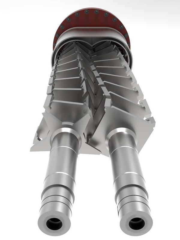设备采用独特的“E”字型捏合元件设计,两根搅拌轴上的勾爪相互啮合,不仅实现了卓越的自清洁功能,有效减少物料残留与死区,更大幅度提高了传热系数;同时,空心搅拌轴及空心盘片具备大量传热表面积,可通入导热介质,极大增加了换热面积,配合快速更新的相边界层,显著强化了高粘物料的传质、传热效率。这种结构设计使设备温度控制精准度大幅提升,特别适合受传热控制的工艺场景。